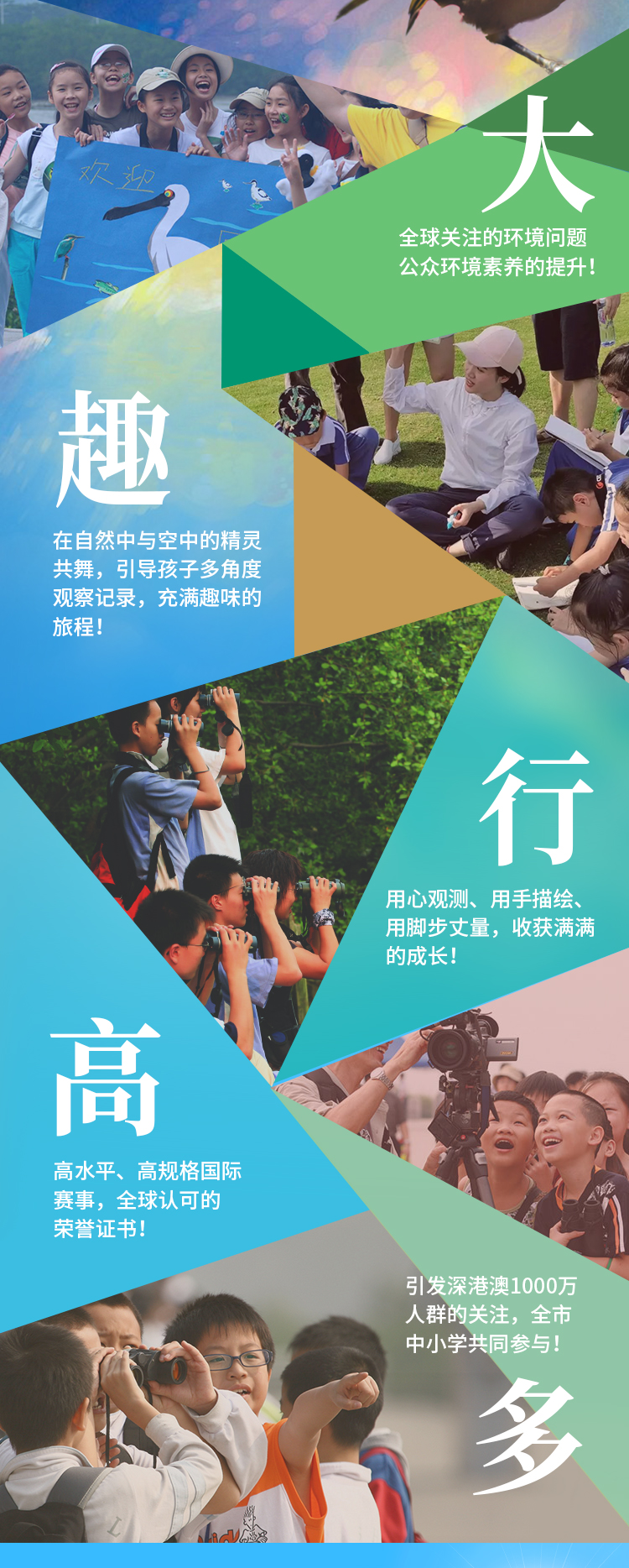 這個賽事為期半年,通過觀鳥觀自然的主題賽事,涵蓋首屆深港澳觀鳥節(jié)暨第二屆國際青少年自然筆記大賽以“立足深圳、面向全球、為地球環(huán)境的可持續(xù)發(fā)展貢獻自己的一份力量”為出發(fā)點,通過引導學生參加系列科普教育主題綜合實踐活動,樹立“愛環(huán)境、愛家鄉(xiāng)”的民族自豪感,培養(yǎng)青少年的環(huán)境意識,提升公民素養(yǎng)。