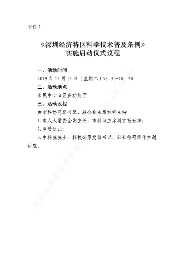 ?2019 年 12 月 31 日(星期二)上午在市民中心 B 區(qū)多功能廳舉行《科普條例》實施啟動儀式及相關會議活動?;顒庸卜謨蓚€階段:第一階段(9:30-10:20)為《科普條例》實施啟動儀式;第二階段(10:30-11:30)為深圳市實施科普條例座談會暨第一次市科普工作聯(lián)席會議、“綱要辦”年度工作會議。屆時,市委、市人大、市政府、市政協(xié)相關領導將出席啟動儀式。