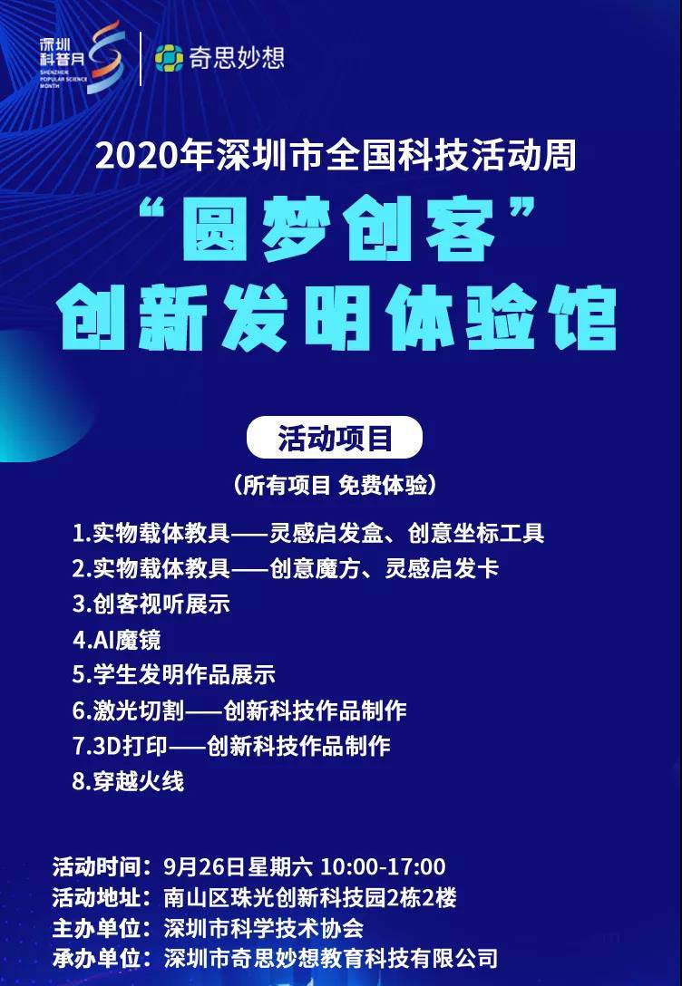 為響應(yīng)國家“創(chuàng)新教育”的號(hào)召,進(jìn)一步提高中小學(xué)生科學(xué)素養(yǎng),培養(yǎng)學(xué)生創(chuàng)新精神,9月26日 10:00-17:00,由深圳市科學(xué)技術(shù)協(xié)會(huì)主辦、深圳市奇思妙想教育科技有限公司承辦的2020年深圳市全國科技活動(dòng)周——“圓夢創(chuàng)客”創(chuàng)新發(fā)明體驗(yàn)館活動(dòng)(以下簡稱“圓夢創(chuàng)客”活動(dòng))將在珠光創(chuàng)新科技園2棟2樓舉行。