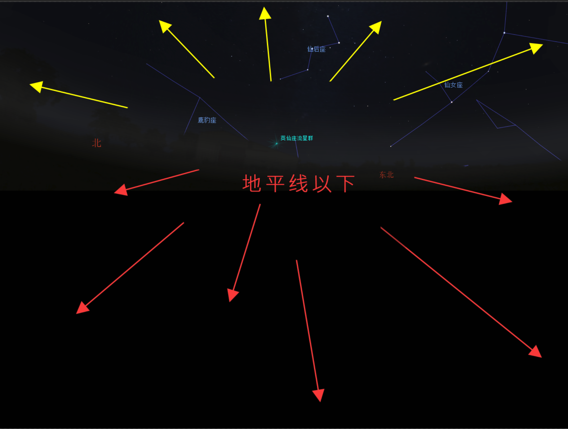 2021年8月12日22時英仙座流星雨輻射點位置示意圖,黃色箭頭示意可見流星,紅色箭頭示意不可見流星。