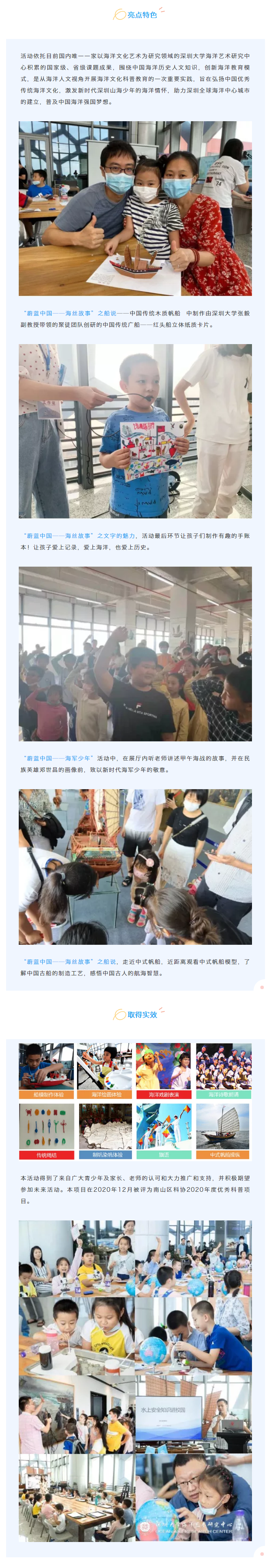 本項(xiàng)目作者為第二屆深圳科普成果展示大賽參賽單位——深圳市海洋文化藝術(shù)研究會(huì)。 “蔚藍(lán)中國(guó)”海洋文化科普教育系列活動(dòng) 2020年在南山區(qū)科協(xié)的大力支持下,本單位策劃實(shí)施了12場(chǎng)圍繞海洋歷史、海洋地理、海洋軍事為內(nèi)容的【蔚藍(lán)中國(guó)】系列科普教育活動(dòng)。 活動(dòng)內(nèi)容如下: 1 “蔚藍(lán)中國(guó)——海絲故事”之船說——中國(guó)傳統(tǒng)木質(zhì)帆船 2、“蔚藍(lán)中國(guó)——海絲故事”之文字的魅力——《島夷志略》和《真辣風(fēng)土記》 3、“蔚藍(lán)中國(guó)——藍(lán)色海洋國(guó)土”?之海圖進(jìn)化史 4、“蔚藍(lán)中國(guó)——藍(lán)色海洋國(guó)土”之藍(lán)色海洋國(guó)土——《聯(lián)合國(guó)海洋法公約》確立的海域范圍 5、“蔚藍(lán)中國(guó)——海軍少年”?之留深過年 海納百福 特別活動(dòng)——中國(guó)航母夢(mèng)? 6、“蔚藍(lán)中國(guó)——海軍少年”?之留深過年 海納百福 特別活動(dòng)——從海軍軍旗發(fā)展,看海軍禮儀
