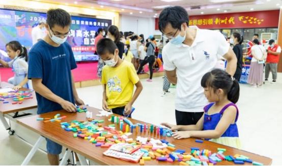 在多米諾骨牌、紙陀螺制作展位,工作人員指導(dǎo)各組家庭將骨牌一塊一塊碼放、學(xué)習(xí)制作彩色的紙陀螺,不僅加強(qiáng)了親子間的溝通交流,增進(jìn)團(tuán)隊(duì)協(xié)作精神,還鍛煉了孩子們的動(dòng)手能力,按照設(shè)計(jì)圖案的巧妙連接,骨牌依次倒下形成一道絢麗的風(fēng)景,大人小孩連連拍手稱贊。