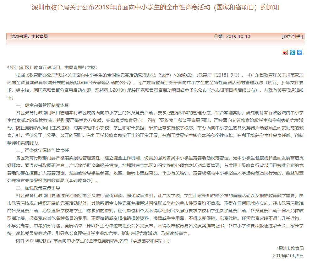 2019年度深圳市面向中小學(xué)生的全市性競賽活動名單(承接國家和省項目)