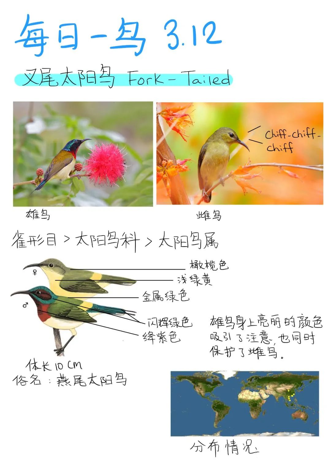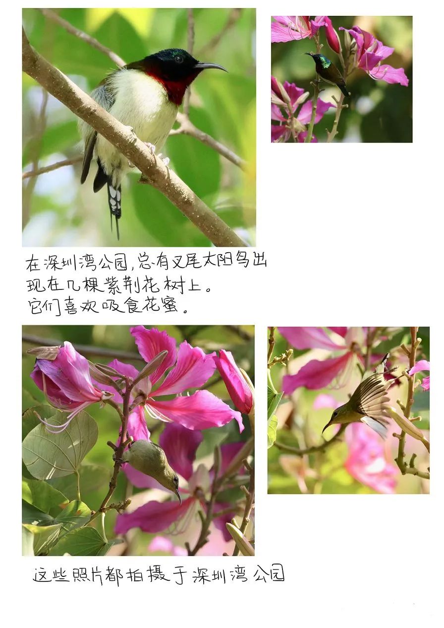 大家好!我是王雨迪,今天要科普的是叉尾太陽鳥。它們是深圳的留鳥,經(jīng)常出沒在深圳灣公園。雄性太陽鳥和雌性太陽鳥有著完全不同的顏色。這種顏色的差別是雄鳥要保護(hù)雌鳥的體現(xiàn)。這些好看的圖片都是舅舅不停的追蹤叉尾太陽鳥時(shí)拍下的。