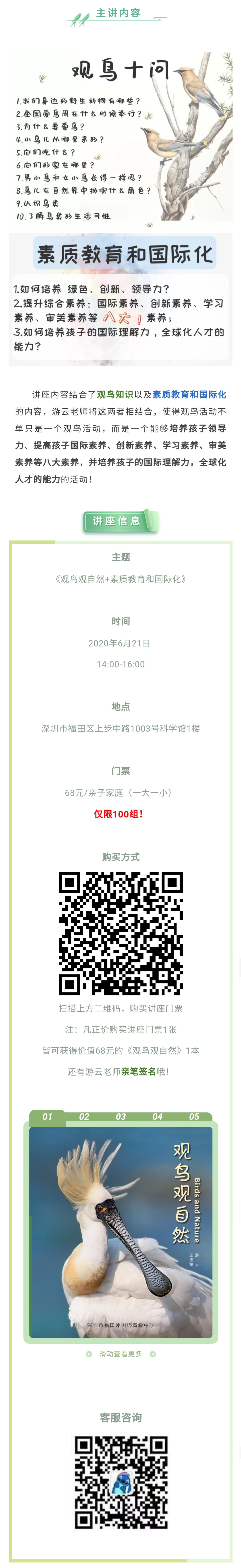 并且,在6月21日下午,游云老師將會(huì)為大家?guī)?lái)一場(chǎng)《觀鳥(niǎo)觀自然+素質(zhì)教育和國(guó)際化》的大講座!