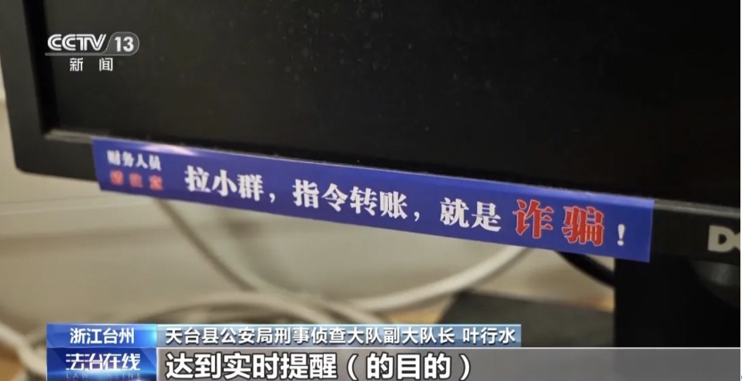 天臺(tái)縣公安局刑事偵查大隊(duì)副大隊(duì)長(zhǎng) 葉行水:這個(gè)案件有一個(gè)特點(diǎn),都是通過(guò)拉小群指定轉(zhuǎn)賬,然后再實(shí)施詐騙。所以我們做了一條反詐標(biāo)語(yǔ),拉小群,指令轉(zhuǎn)賬,就是詐騙!貼在每一個(gè)財(cái)務(wù)人員的電腦上,達(dá)到實(shí)時(shí)提醒的目的。