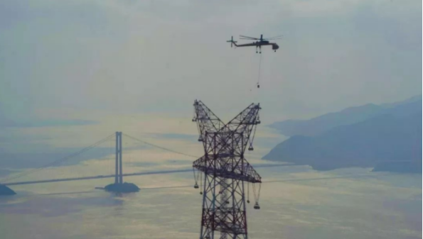 比如在舟山 500 千伏聯(lián)網(wǎng)輸變電工程西堠門(mén)大跨越施工中,“空中起重機(jī)”——S-64F運(yùn)輸直升機(jī)就登場(chǎng)了。