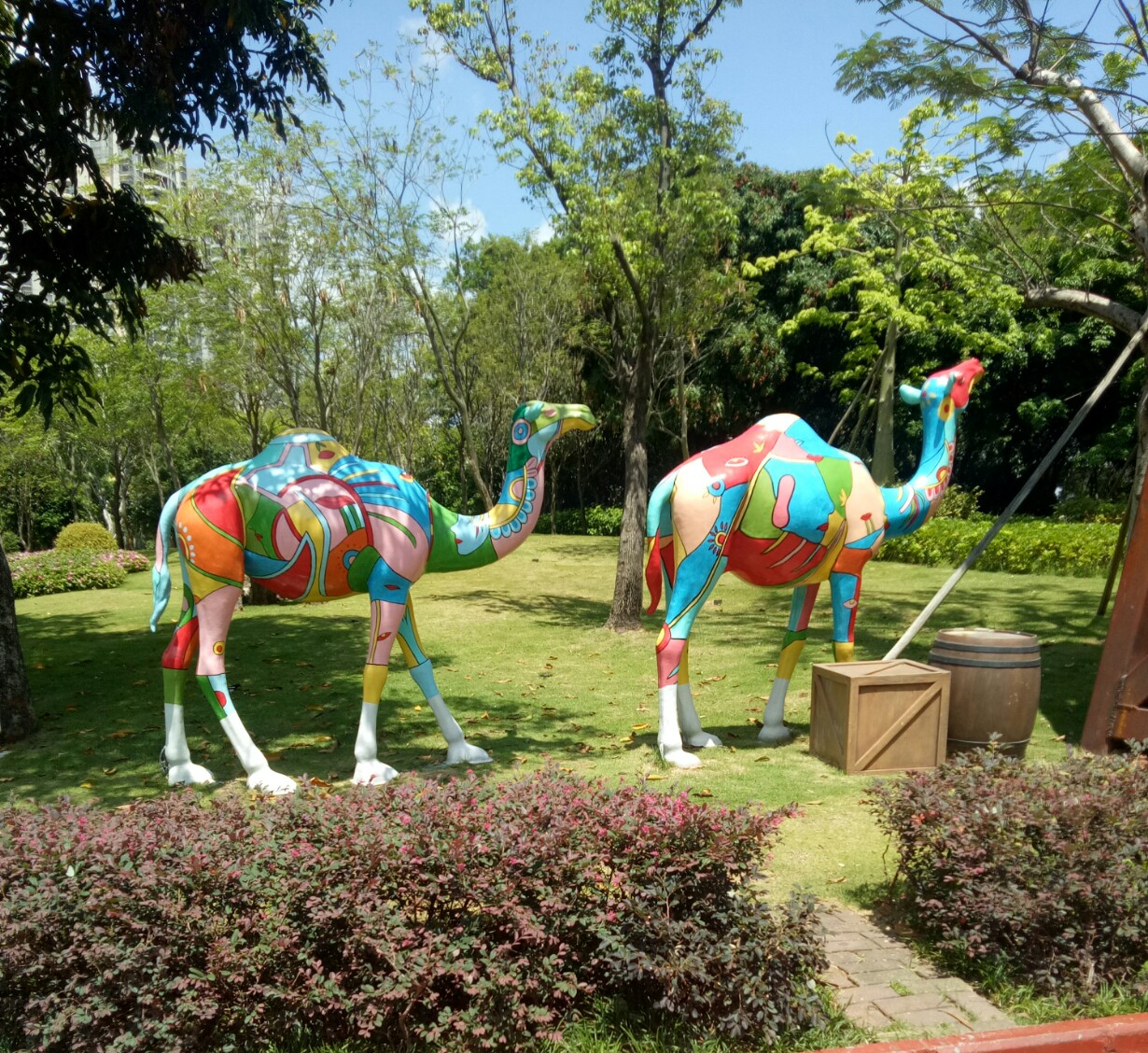 這幅作品的中心是兩只駱駝,兩只駱駝的身上,有著各式各樣的花紋,駱駝代表的便是古代的絲綢之路,駱駝身上的花紋則代表了古代商人之間的貿(mào)易往來,文化繁榮,經(jīng)濟昌盛。也告訴了我們,現(xiàn)在應該積極對外交往,使得我們經(jīng)濟繁榮,文化昌盛。