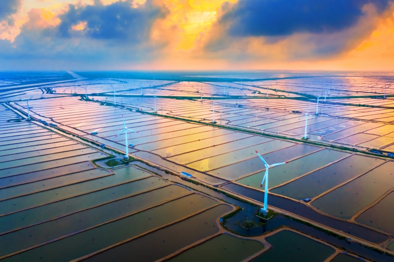 江蘇省鹽城市大豐區(qū),夕陽照耀下的海邊風(fēng)能漁場