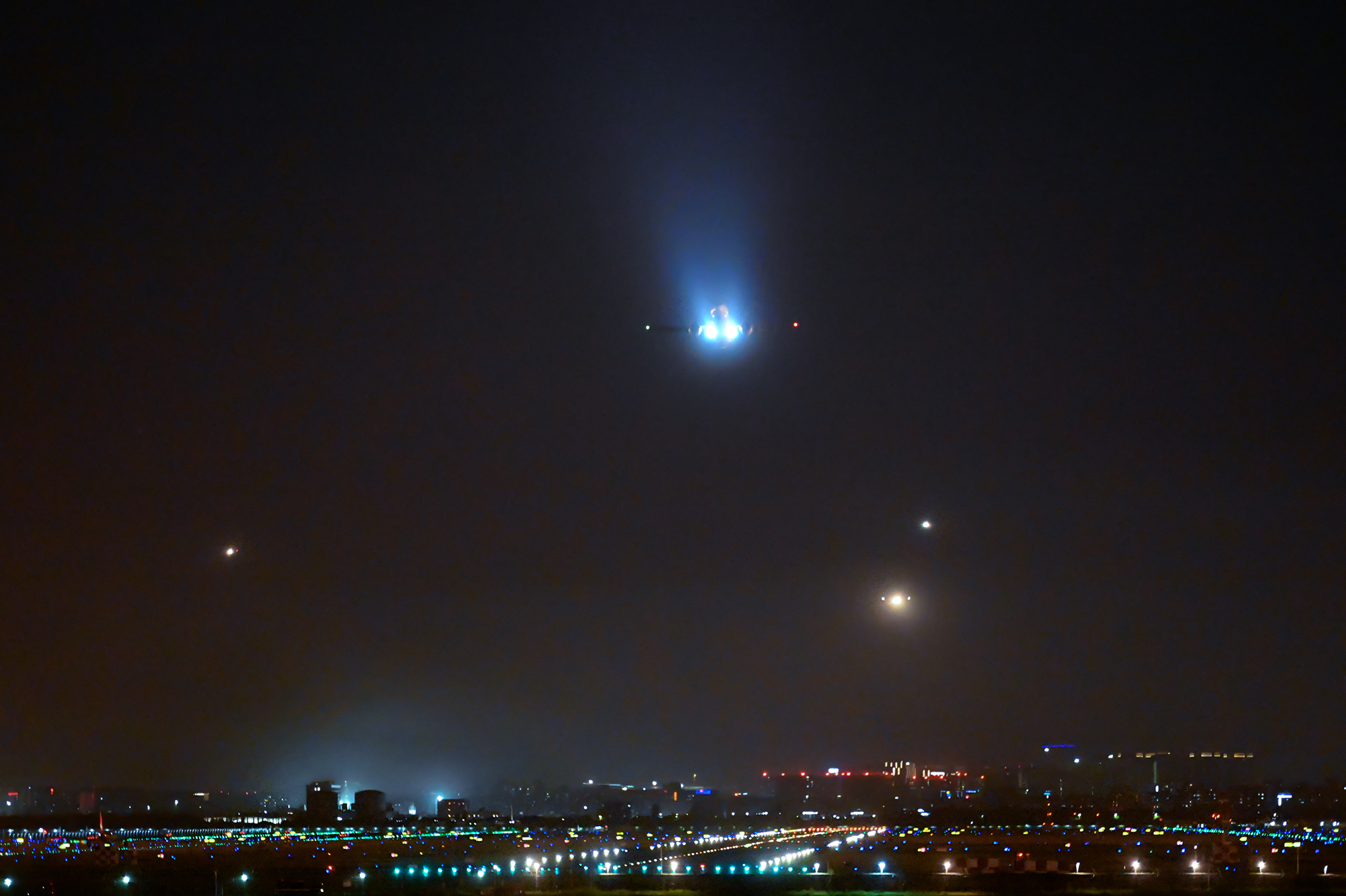 那天夜里,我專程到機(jī)場(chǎng)南人行天橋拍攝飛機(jī)起飛,璀璨奪目的深圳機(jī)場(chǎng)夜色格外美麗,跑道上飛機(jī)在有序地起降,遠(yuǎn)遠(yuǎn)望去就像螢火蟲一樣在閃爍著,忽然我看到一家三口散步路過駐足遠(yuǎn)眺飛機(jī)起飛地方,爸爸抱著孩子,媽媽指著遠(yuǎn)處剛起飛的飛機(jī)給兒子講解,多么溫馨、幸福的一刻,我連忙走到他們身后定格了這動(dòng)人的一刻,這就是航空的魅力!